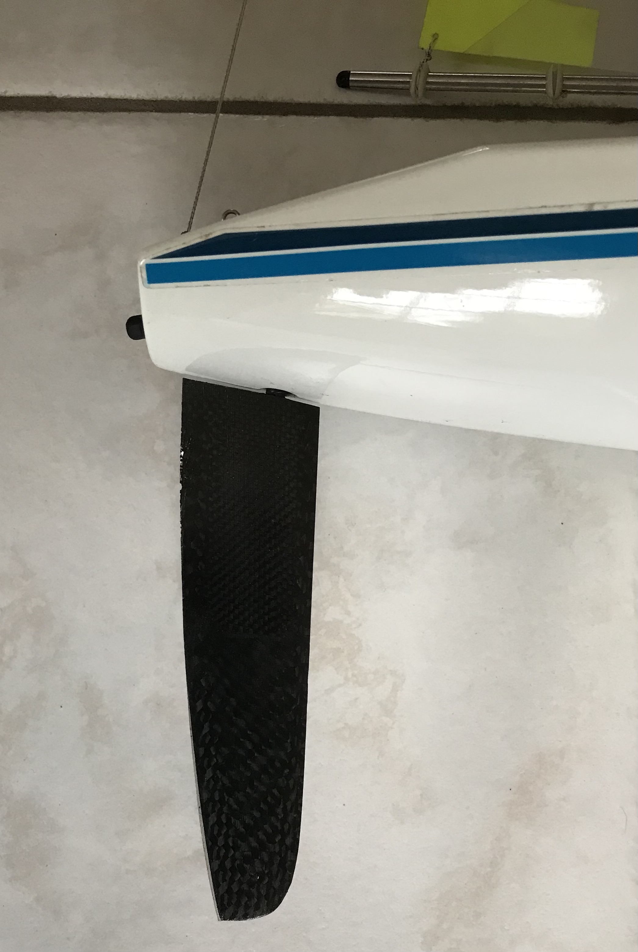 Le second est celui vendu pour le DF65, assez grand, bien proportionné et compensé. le haut est dessiné pour le fond de la coque du DF, cela ne peut pas forcément convenir à une autre forme de coque. Mais cela passe sur le Compass et c'est celui là que j'utilise avec. Il faut reprendre la mèche pour augmenter sa longueur.