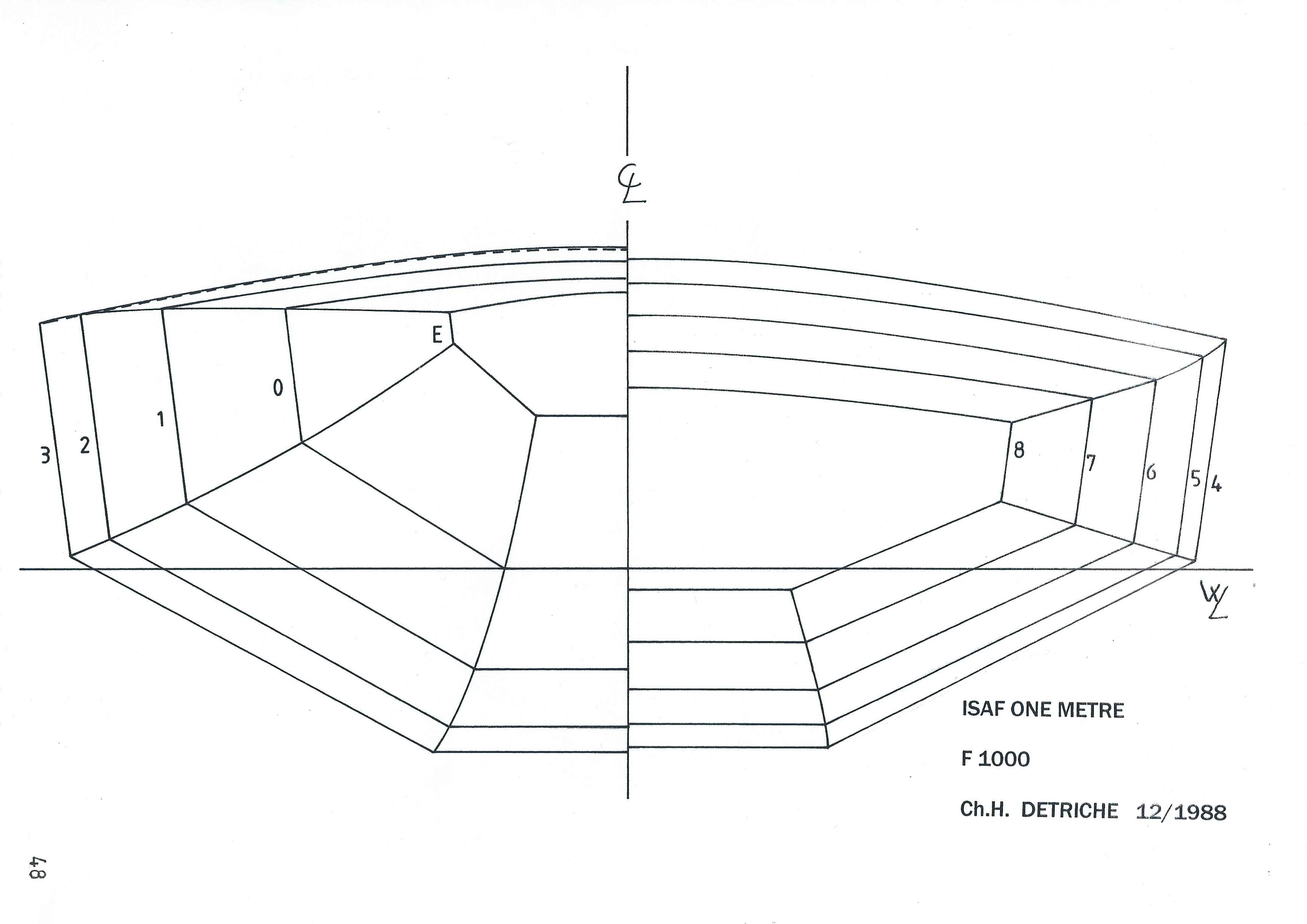 Un exemple du scow IOM "F1000" de C. Détriché (dont les plans se trouvent sur le web), on remarque que le concepteur a gardé de la marge au niveau de la ligne de flottaison avant, le bateau n'est pas à une LF de 1 mètre, mais sa proue (que l'on appelle "marotte" sur les scows) permet de récupérer de la portance à l'avant et éviter ou retarder (un peu) l'enfournement...